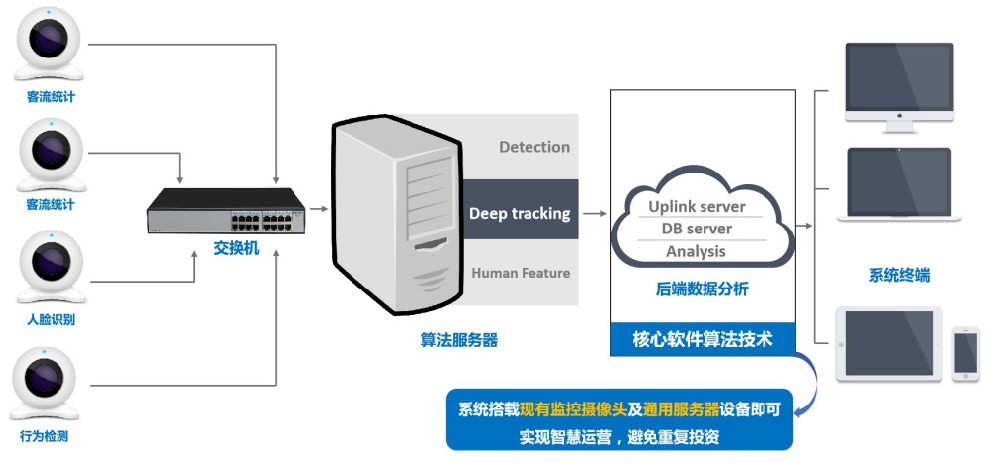 客流大數據監測技術人工智能視頻分析解決方案平臺涵蓋目標檢測、人臉識別、行為分析、跨攝像頭重識別四大核心技術。